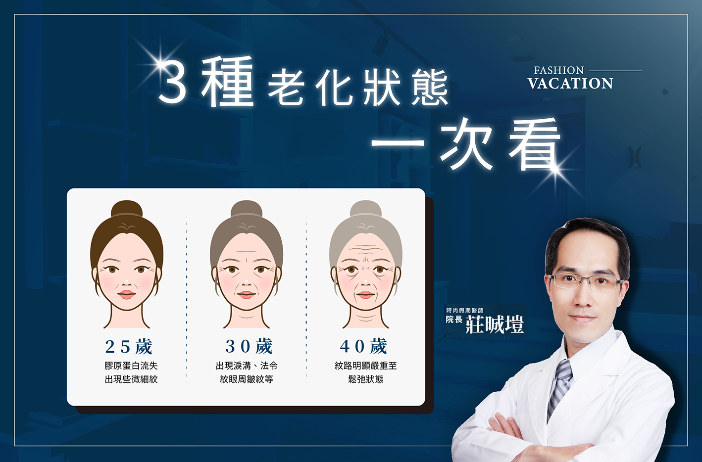 隨著年齡老化會造成真皮層膠原蛋白、彈性纖維流失,讓肌膚失去緊緻度等。皮下脂肪層萎縮、支撐皮膚的韌帶或肌肉張力下降,也會導致肌膚下垂鬆弛、皺紋產生等。